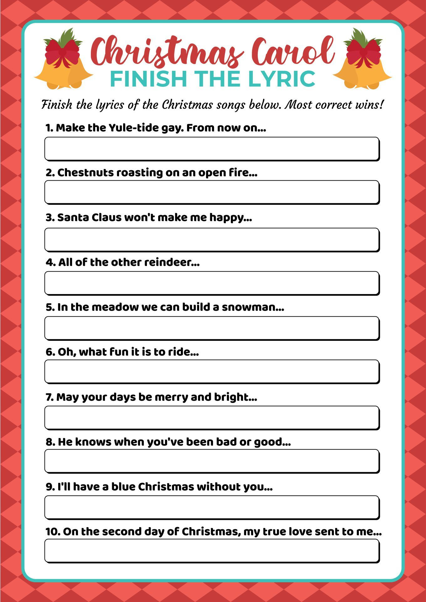 Finish the Christmas Song Lyrics Game Printable Free – Get ready to jingle bell rock with this exciting and entertaining Christmas song lyric game! Whether you’re hosting a holiday party or just looking for a festive activity to enjoy with your loved ones, this game is sure to bring some cheer to your celebrations. Simply download and print out the free game cards, grab some friends or family members, and get ready to test your knowledge of classic Christmas tunes!
