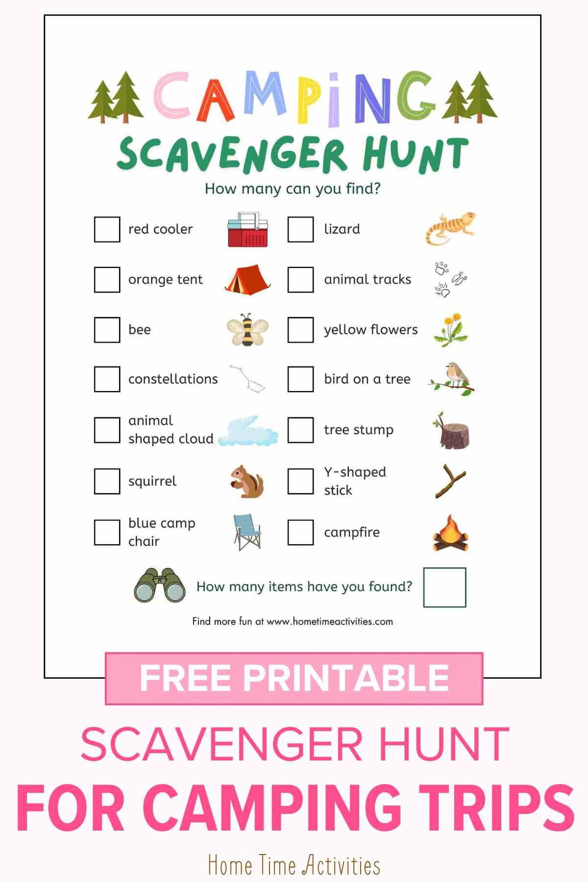 After a day of exploring and scavenging, gather around the campfire with your fellow adventurers and share stories of your discoveries. Whether you found everything on the checklist or stumbled upon unexpected treasures, the memories you create during this camping experience will last a lifetime. So what are you waiting for? Download our free printable Camping Scavenger Hunt, pack your sense of adventure, and get ready for the camping trip of a lifetime! Adventure awaits – are you ready to answer the call?