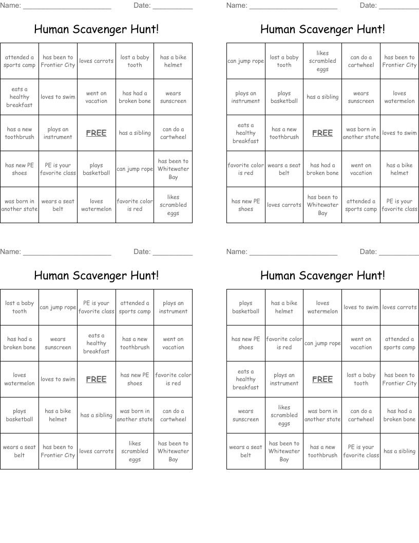 Human Scavenger Hunt! Bingo Cards - Wordmint in Scavenger Hunt Bingo Cards